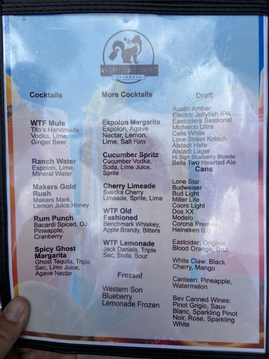 This menu resonates with the casual, outdoorsy, and upbeat feel of the bar. Whether you’re here for a sports game, a night of dancing, or just relaxing with friends, the food and drinks create a comfortable backdrop to enjoy whatever the evening holds.
